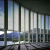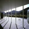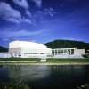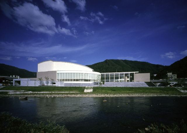 新見市は、JR岡山駅から北へ特急で1時間あまり、中国山地ただ中のまちで、その中央を高梁川の清流が流れる。その川沿いに、大小2つのホールからなる「文化交流館」と、「生涯学習センター」をあわせた複合施設である。アプローチから川の方へ、建物中央の人工地盤上に伸びやかに広がる通り抜けの広場をつくり、その下を駐車場にしている。1000席収容の大ホールは走行反射板と昇降プロセニアムを備えて残響時間を劇的に変化させることが出来、コンサートにも(残響2.1秒)にも演劇など(残響1.4秒)にも適した多目的ホールである。●設計監理:日建設計