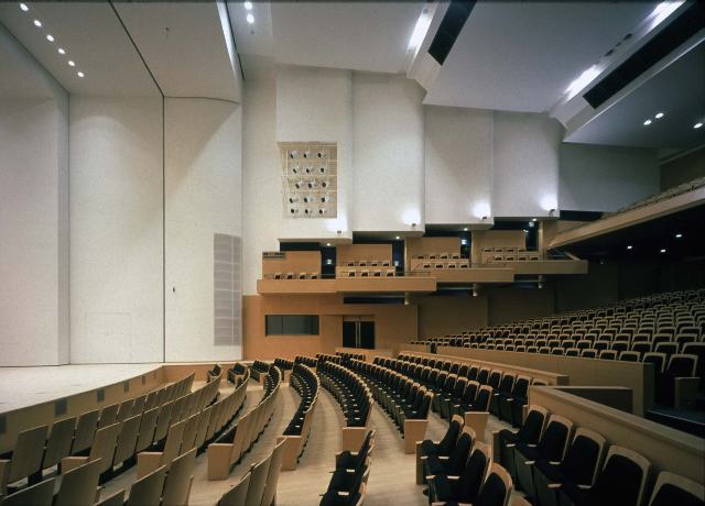 新見市は、JR岡山駅から北へ特急で1時間あまり、中国山地ただ中のまちで、その中央を高梁川の清流が流れる。その川沿いに、大小2つのホールからなる「文化交流館」と、「生涯学習センター」をあわせた複合施設である。アプローチから川の方へ、建物中央の人工地盤上に伸びやかに広がる通り抜けの広場をつくり、その下を駐車場にしている。1000席収容の大ホールは走行反射板と昇降プロセニアムを備えて残響時間を劇的に変化させることが出来、コンサートにも(残響2.1秒)にも演劇など(残響1.4秒)にも適した多目的ホールである。●設計監理:日建設計