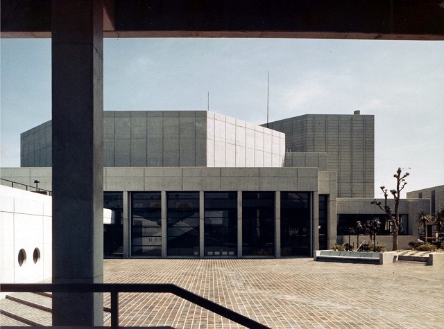 当時の幹線道路が西から来て北へ左折する角に面した敷地の中央に程よい広さの中庭−広場をつくり、これを取り囲むように、大ホール・小ホール・公民館などの施設を設けた。人々は広場をを通って核施設にアプローチする。横川が1968年に入社後本格的に関わった最初の建物で、1970年3月から1971年8月までの18か月の工事期間中、山口市建築課職員の方と一緒に、現場係員として駐在、全ての施工図・製作図のチェック、材料・色の選択決定を行った。