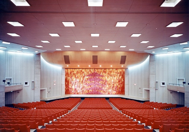 当時の幹線道路が西から来て北へ左折する角に面した敷地の中央に程よい広さの中庭−広場をつくり、これを取り囲むように、大ホール・小ホール・公民館などの施設を設けた。人々は広場をを通って核施設にアプローチする。横川が1968年に入社後本格的に関わった最初の建物で、1970年3月から1971年8月までの18か月の工事期間中、山口市建築課職員の方と一緒に、現場係員として駐在、全ての施工図・製作図のチェック、材料・色の選択決定を行った。