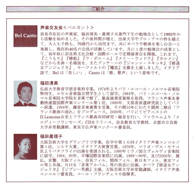 1994〜 福田清美氏に師事。声楽交友会「ベルカント」“Bel Canto” に入会。