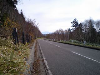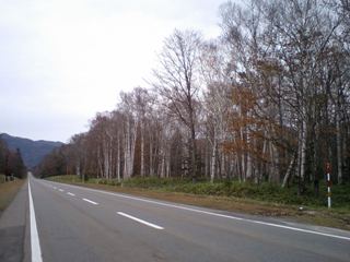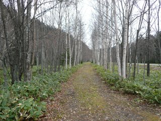 糠平営業所前のバス停前から続く白樺?の並木・・・