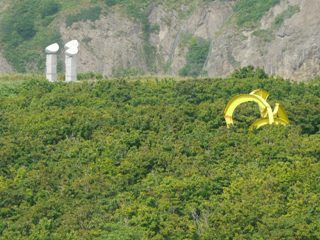山の斜面に白く見える標識が奥尻港の目印。