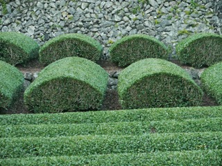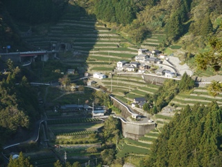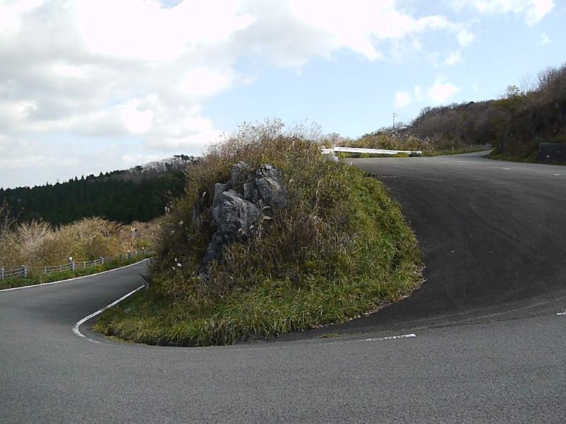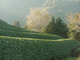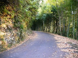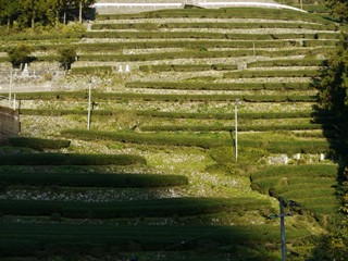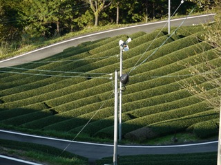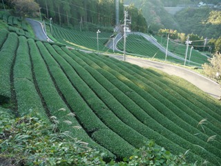 急斜面の茶畑の中をうねうねと弧を描く道。