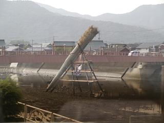 守江湾にそそぐ八坂川と杵築大橋が見える