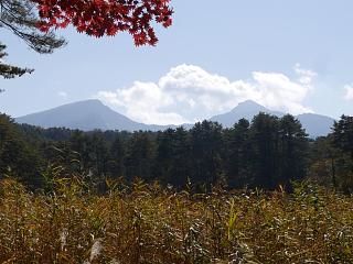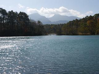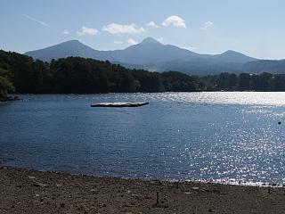 池の彼方に磐梯山が見えます