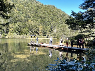 「明神池」に突き出した「嶺宮遥拝所」がある!